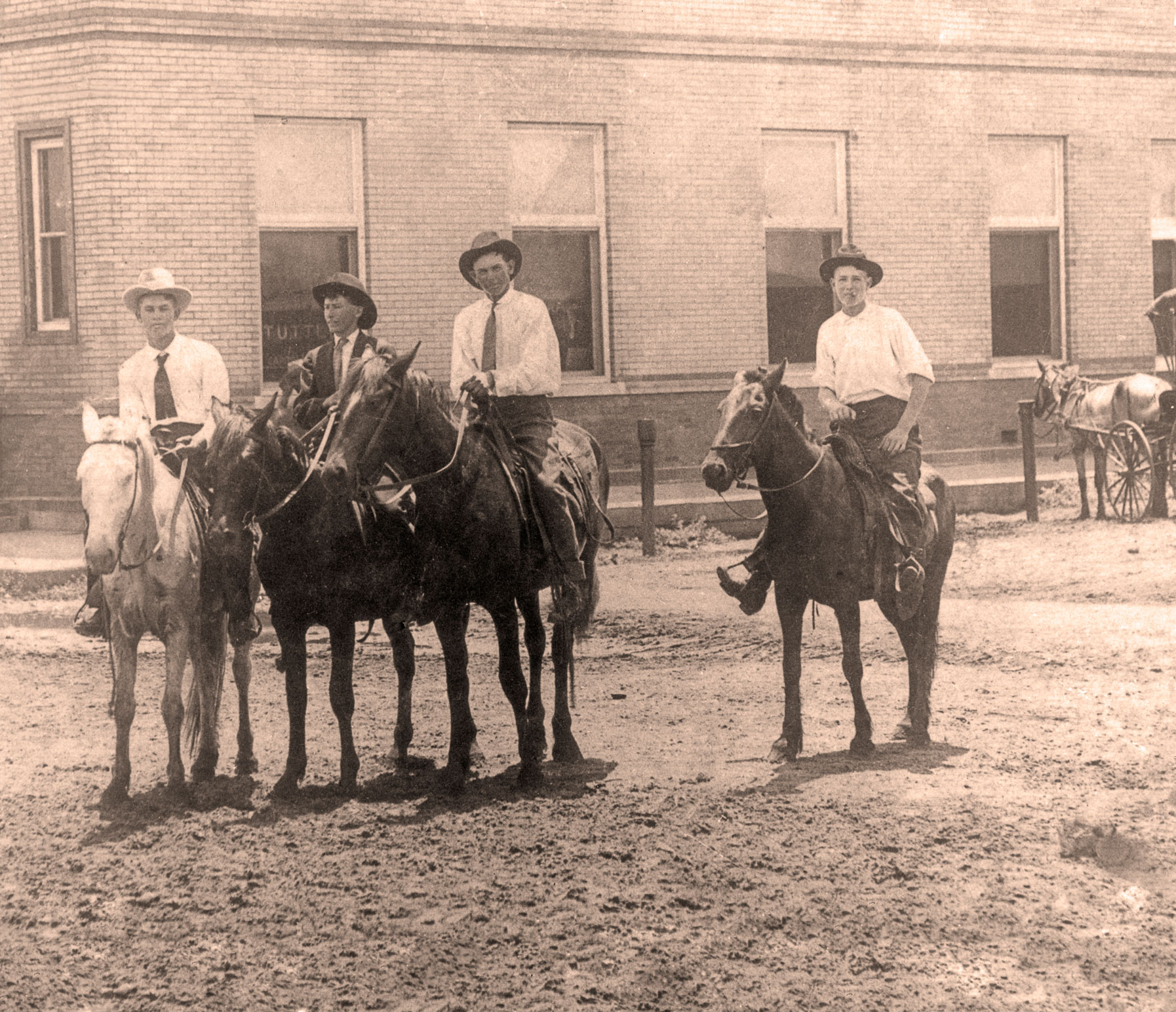 Were these boys headed for Sunday services or Saturday night fun? The true story of these cowboys is unknown, but that doesn’t stop locals from speculating what they might be doing in this downtown Tuttle intersection circa 1900. This image was shared by John and Cherryl Paxton from the Norma Jean Gambill Collection of early Tuttle photography. Cherryl is a member of the Tuttle Historical Society. The Paxtons have lived in the same home west of Tuttle for nearly 60 years.