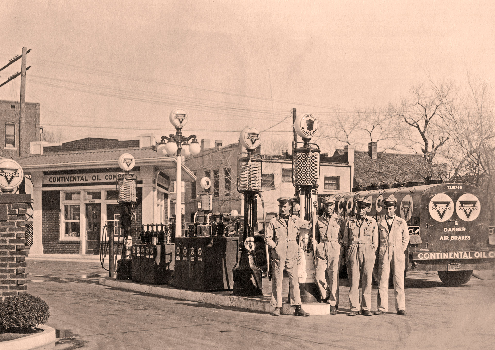 From drilling to retail, the oil business has always fueled Oklahoma’s dreams. For most of its history, Conoco Oil was known an Oklahoma company built by E.W. Marland of Ponca City (1874-1941), a high-energy entrepreneur who also served single terms as U.S. Representative and Oklahoma Governor. Conoco actually was founded in Utah but its headquarters moved to Ponca City, Okla., when Marland purchased Continental Oil in 1929, as The Great Depression rocked the world. Today the iconic Conoco symbol remains a globally recognized brand that has shared Oklahoma’s enthusiasm for business and energy from its founding in 1875 until it merged with Phillips 66 in 2002. Phillips 66 was founded in Oklahoma by another famous Oklahoman, Frank Phillips of Bartlesville, in 1917. The local Tuttle men in this photo are believed to be Sam Brand, George Hogan, Ed Brand and Thomas Hardin. Hogan is the late uncle of Tuttle historian Judy Hogan, who shared this image for the Tuttle Then and Now Gallery. She is a member of the Tuttle Historical Society.