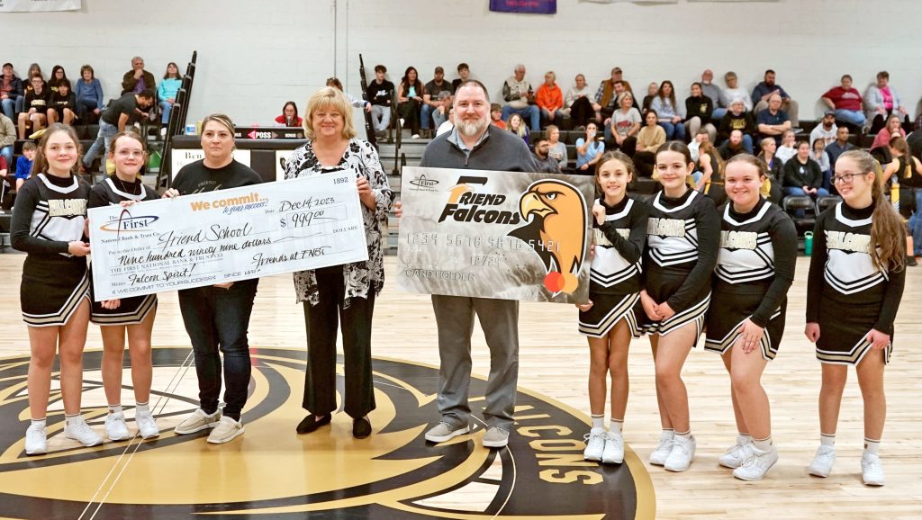 The Friend community celebrates a $999 donation it earned in December from The First National Bank & Trust Co. This donation was made possible by the fans who carry the Friend Falcons Team Spirit Card. Receiving that donation is Principal Susan Coble (third from left), surrounded by Friend cheerleaders and FNBT bankers.
